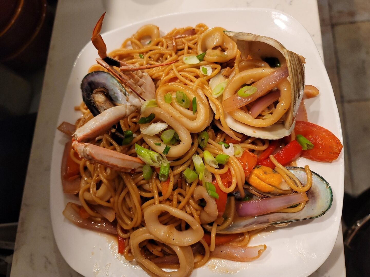 Authentic TALLARIN CON MARISCOS from Mikhuy Peruvian Restaurant in South Slope, Brooklyn. Peruvian-Chinese stir fry with mixed seafood, red onions & tomatoes. Experience the best Peruvian mariscos flavors near Park Slope.